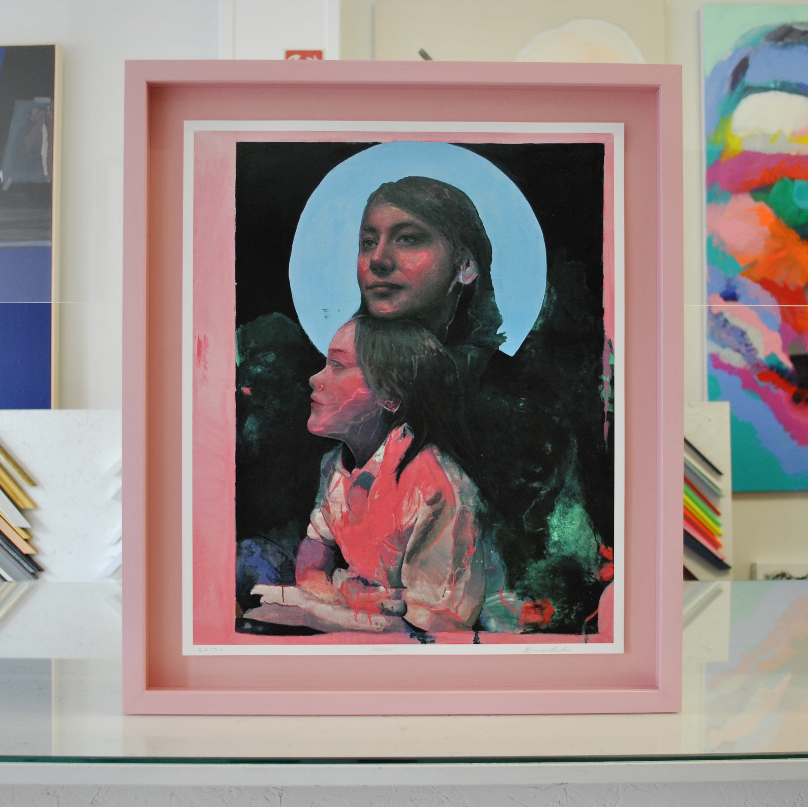 Each colour-drenched frame is custom made in our Belfast studio. Colours are chosen in consultation, taking into account the artwork, surrounding interior, and overall aesthetic. This framing style is particularly well suited to contemporary artworks, exhibitions, and statement pieces where the frame becomes an integral part of the work itself.